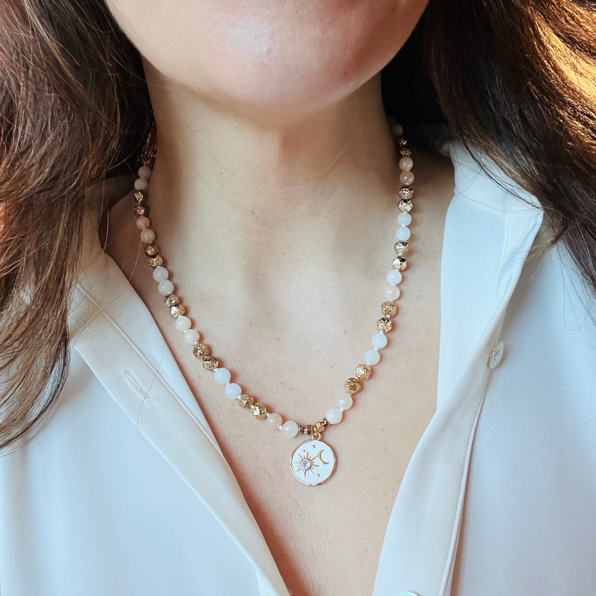 This Hand Knotted 60 6mm Beads Short Mala is made with the following Gemstones & Crystals: White Quartz, Gold Lava Stone, Aura Agate, Hematite, and finished with a Celestial CZ Enamel Pendant and Gold Toggle Clasp.