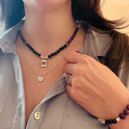 This Handcrafted Short 6mm Mala Necklace with Silver Accent Chain is made with the following Gemstones & Crystals: Lepidolite, Astrophyllite, Selenite, Jet, Hematite, and finished with a Crescent Moon Burst Pendant and Crescent Moon Chain Pendant.