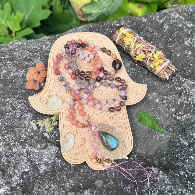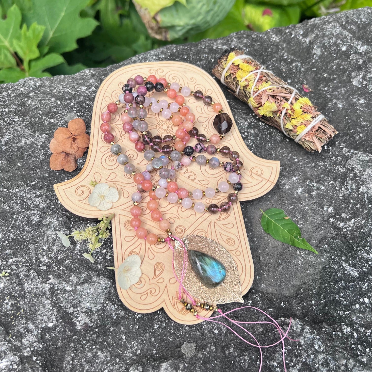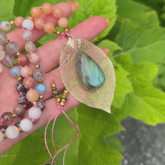 This Hand Knotted 108 Beads Mala Necklace is made with the following Natural Gemstones & Crystals: Orange Calcite, Smoky Quartz, Peruvian Pink Opal, Pink Mangano Calcite, Rhodonite, Labradorite, Hematite, and finished with a Labradorite Gold Leaf Pendant and Faceted Oval Smoky Quartz Halfway Marker Bead.