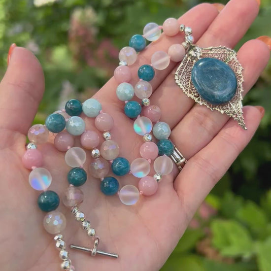 This Hand Knotted 40 8mm Bead Short Mala Necklace is made with the following Gemstones & Crystals: Pink Opal, Aura Strawberry Quartz, Opalite, Amazonite, Hematite, and Finished with a Blue Apatite Silver Leaf Pendant and Silver Toggle Clasp.